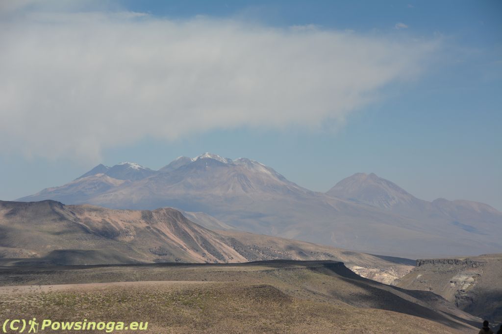 Z Arequipy pojechaliśmy na północ. Droga serpentynami wznosiła się ostro do góry. Widoki były fantastyczne. W oddali widać było dymiący wulkan Sabancaya wznoszący się na wysokość nieomal 6 tysięcy metrów. Sznur ciężarówek powodował, że chwilami jechaliśmy bardzo wolno. Gdy tylko droga była wolna, kierowca wyprzedzał samochody lewym pasem, momentami wywołując u nas dreszcze emocji. Generalnie droga trudna, miejscami mocno eksponowana i bardzo ruchliwa. Chwila nieuwagi mogłaby skończyć się tragicznie. Mijaliśmy miejsce, gdzie w 2002 roku minibus wynajęty przez chorzowskie biuro podróży stoczył się w przepaść. Zginęło wówczas osiem osób w tym sześcioro Polaków.