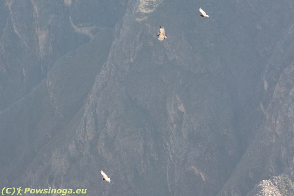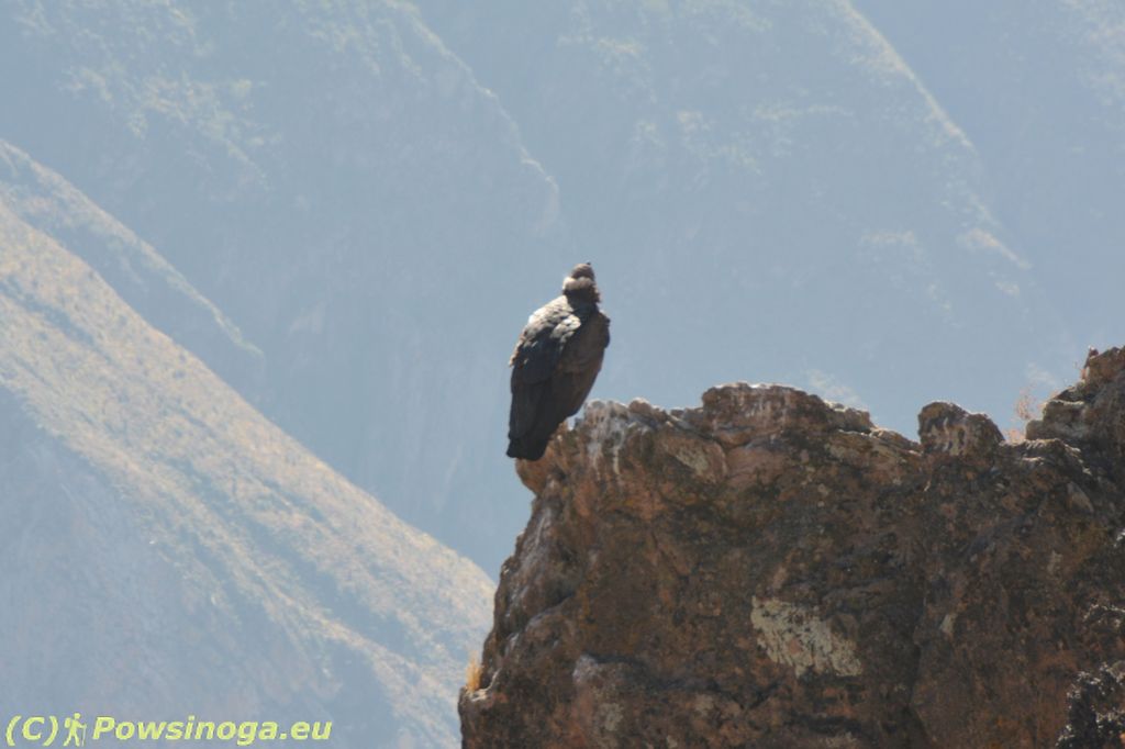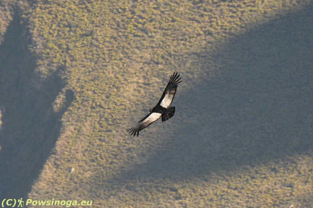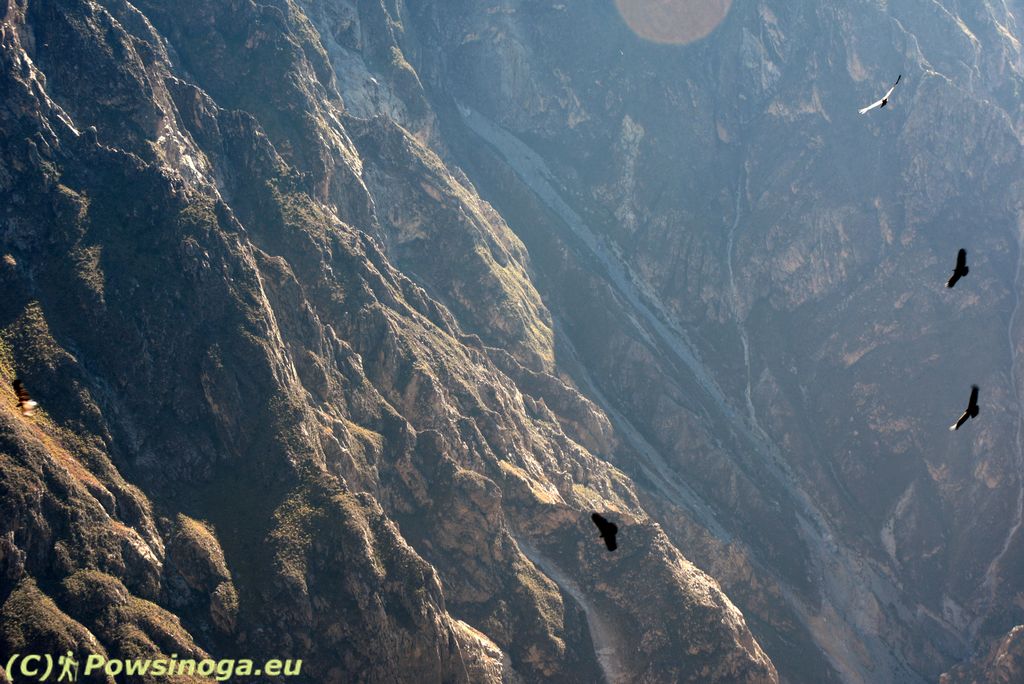 Cruz de Condor to miejsce na lewym brzegu kanionu rzeki Colca. Sam kanion w tym miejscu jeszcze nie jest bardzo głęboki – ma „zaledwie” nieco ponad 600 m głębokości. Kilkadziesiąt kilometrów na zachód ta głębokość to czasami ponad 3 km. Rzeka Colca wpada do oceanu, ale przy ujściu w porze suchej nie robi specjalnego wrażenia. Droga w punkcie obserwacyjnym Cruz de Condor zbliża się do krawędzi kanionu, który tutaj dosyć stromo opada w dół. Kondory do latania potrzebują prądów wstępujących, a te pojawiają się po kilku godzinach operacji słonecznej. Ptaki często są wynoszone przez prądy powietrzne niemal wprost pod obiektywy obserwujących je turystów. Czasami jest ich nawet kilkanaście. Tym razem też się pojawiły. Przez godzinę wylatywały coraz wyżej i wyżej patrolując okolicę. Są rzeczywiście imponujące. Rozpiętość skrzydeł może osiągać ponad 3 metry. Same ptaki ważą do 15 kg, przy czym samce są nieco większe od samic. Zakładają gniazda na występach skalnych, co ułatwia im „start” do szybowania. Osiągają pułap 5000 metrów. Mogą dożywać nawet 100 lat. Majestatycznie szybujące ptaki działały na nas hipnotycznie. Zafascynowani spektaklem na niebie nie zauważyliśmy jak szybko minęła godzina. Przed odjazdem mieliśmy jeszcze okazję skosztować soku z kaktusów, który jest lokalnym przysmakiem. Nieco kwaskowy, w kolorze niedojrzałego kiwi i podobny w smaku. Podobno bardzo zdrowy. Dla mnie jednak skutki tej degustacji miały się okazać fatalne.