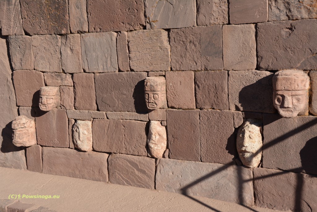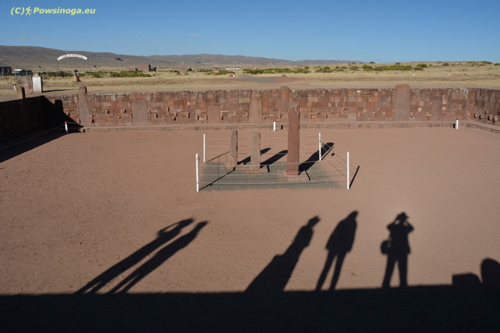 W pewnym oddaleniu od muzeum znajdują się odkryte stanowiska archeologiczne – świątynia Kalasasaya i piramida Akapana, na którą niestety nie zdążyliśmy wyjść. Nabieranie szacunku dla biurokracji boliwijskiej na przejściu granicznym kosztowało nas po prostu zbyt wiele czasu. Określenie piramida – to może jest trochę na wyrost. W każdym razie jest to wzniesienie ze śladami murów, a sięga ono na wysokość ok. 17 metrów. Na szczycie znajdują się pozostałości zbiornika wodnego – prawdopodobnie gromadzeniu wody i nawadnianiu służyła cała ta budowla. Kalasasaya to wielki plac oraz zagłębiona w ziemi konstrukcja o kształcie prostokąta z kamiennymi ścianami w których wyrzeźbione są głowy. Przyszło mi skojarzenie z głowami w komnatach wawelskich, ale nie jestem pewien czy jest ono w pełni trafione. Sama konstrukcja jest idealnie dopasowana do stron świata, a w całym kompleksie znajduje się jeszcze brama księżyca i brama słońca. Całość była wykorzystywana prawdopodobnie do obserwacji astronomicznych. Replika świątyni Kalsasaya znajduje się na jednym z głównych placów w La Paz.
